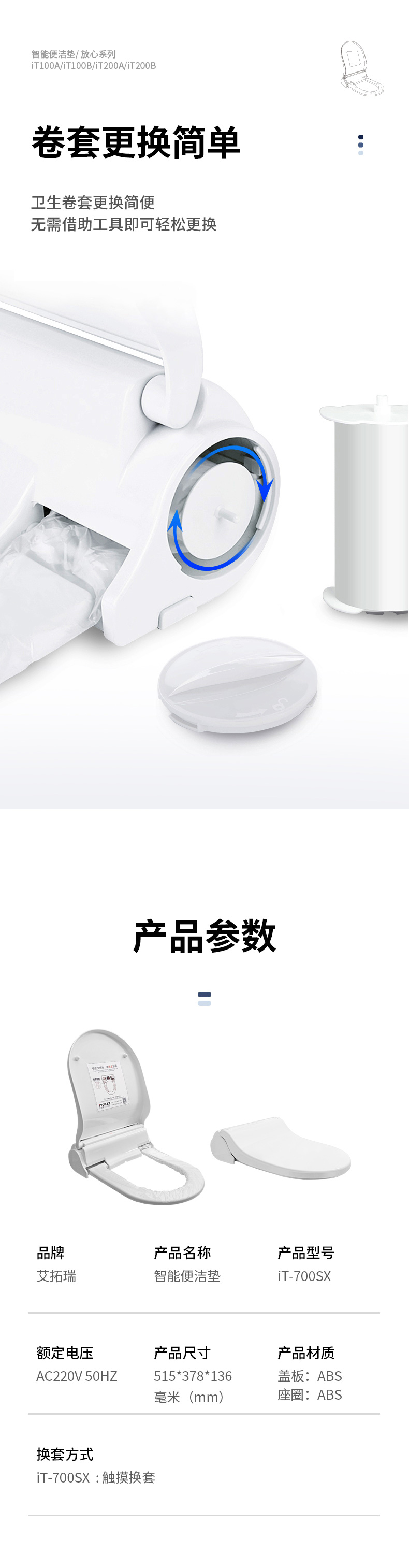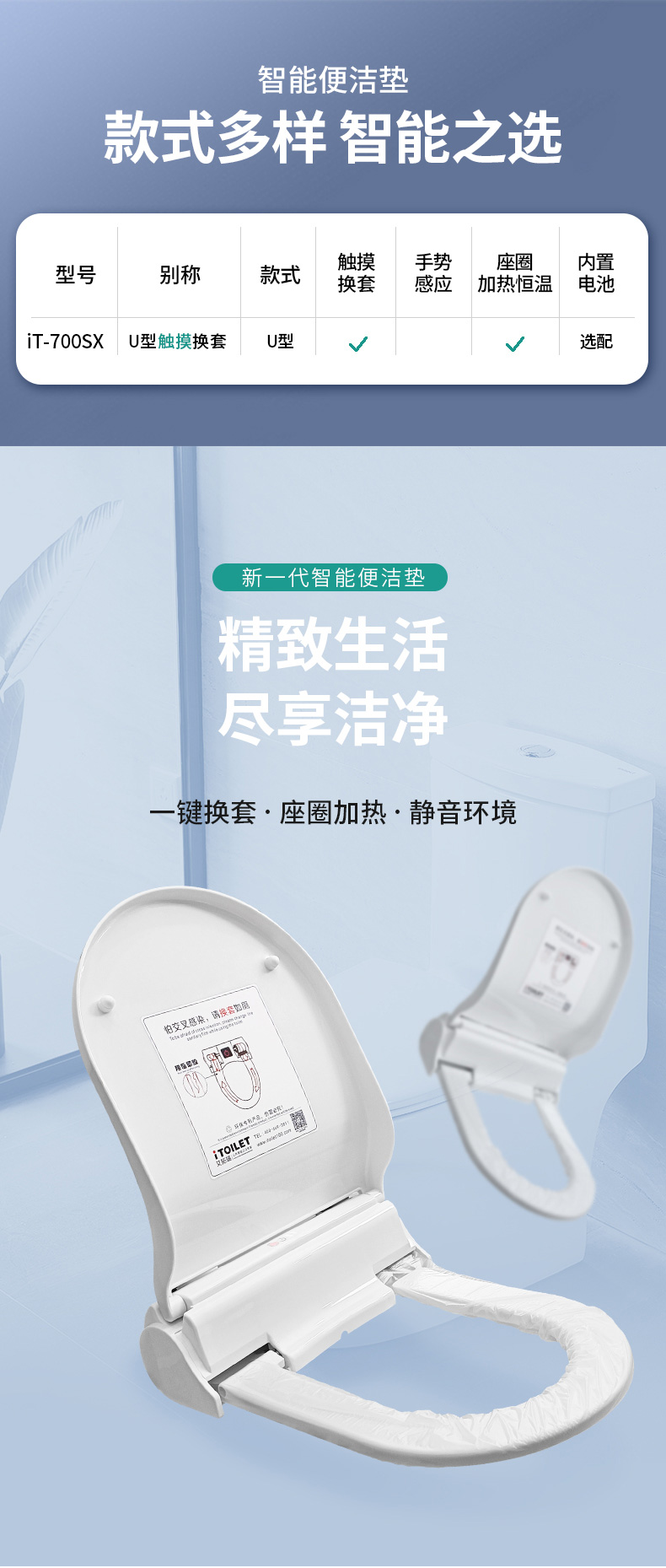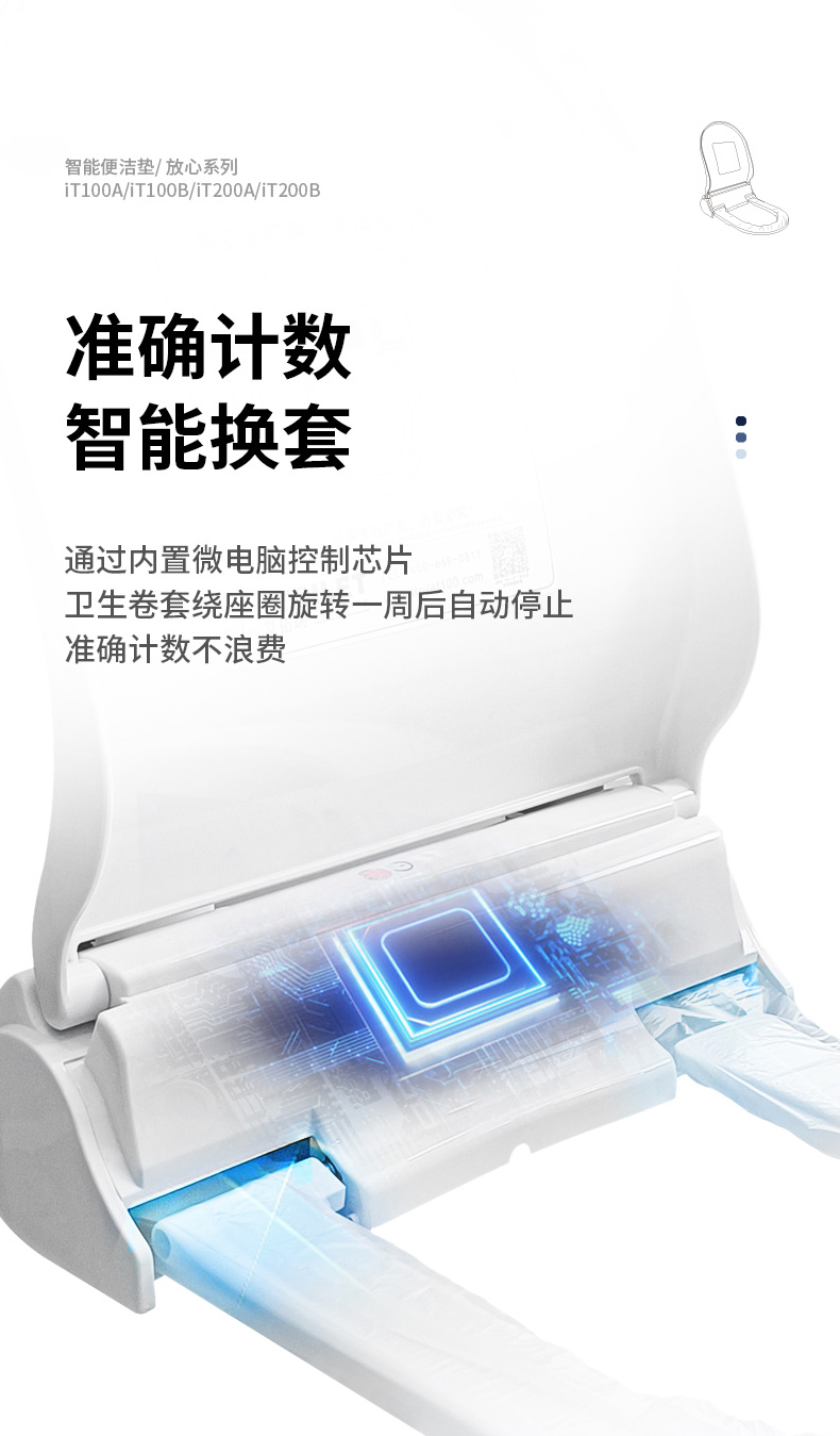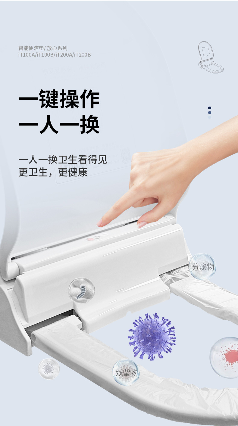 艾拓瑞iTOILET智能便潔墊(自動換套馬桶蓋),自動更換一次性便潔套(衛(wèi)生膜),一人一換,衛(wèi)生看得見。獨立的電池艙,多重防水防潮;適用于酒店賓館/機場/商場/娛樂休閑/會所/會展等公共場所馬桶。